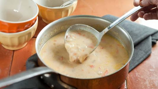 Pour half the soup into a food processor and process until smooth. Return to saucepan. Add beer and cheese and cook until cheese melts. Add milk until desired consistency is reached.