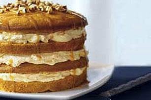 CUT each cake layer horizontally in half with serrated knife; stack on serving plate, spreading cream cheese filling between layers. (Do not frost top layer.) Drizzle with caramel topping just before serving; sprinkle with nuts. Refrigerate leftovers.