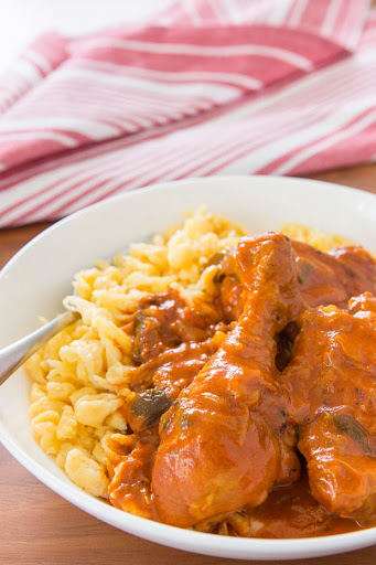 Divide the chicken among plates and serve with a dollop of the sour cream and the cucumbers (if serving).