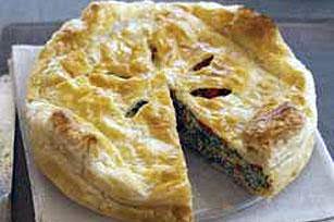 PREHEAT oven to 400°F. Unfold pastry sheet and roll out one sheet to about 11-inch square and one to 12-inch square. Line bottom and side of greased 9-inch springform pan with 12-inch pastry sheet.