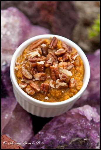 When potatoes are fully cooked through, using a hand blender, blend the sweet potatoes inside your crock pot insert, adding the second 1/2 cup of juice. Season with more cinnamon and nutmeg to taste. Top with pecans and enjoy.