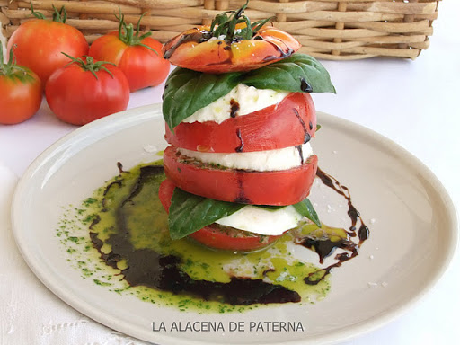 Montamos el plato colocando primero la rodaja de tomate aderezar con la pimienta,escamas de sal y un poco de aceite de albahaca una rodaja de mozarella 2 hojas de albahaca, repetimos la operación intercalando las rodajas de tomate mozarella y albahaca hasta terminar con el sombrerete de tomate ponemo un poco de sal y adornamos el plato con el aceite de albahaca y la reducción de vinagre
