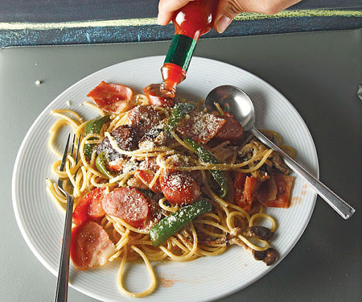 When the spaghetti is ready, drain in a colander. Add to the saucepan and toss for 30 seconds, so the pasta absorbs the flavors of the sauce. Turn off the heat and divide the pasta and sauce among 4 plates. Top with the Parmesan cheese and season with the Tabasco, to taste, and serve.