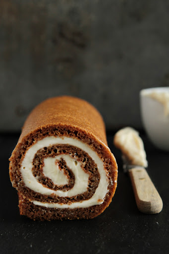 4. In a medium bowl, beat cream cheese, powdered sugar, butter and vanilla extract until smooth. Carefully unroll cake; remove towel. Spread cream cheese mixture over cake. Reroll cake. Wrap in plastic wrap and refrigerate at least one hour.