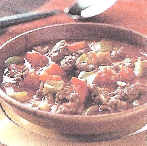 In a dutch oven, cook beef over medium heat until no longer pink; drain. Stir in the remaining ingredients; bring to a boil. Reduce heat; cover and simmer for 30-40 minutes or until peppers are tender.