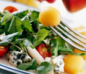 • Se monta la ensalada colocando en el centro del plato los berros, el queso azul troceado, las bolitas de melón, la pera y los tomates.