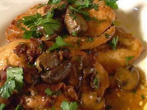 Place cooked chicken breast on a plate and top with onions, mushrooms, and sauce.