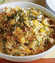 2. In a medium bowl, beat the reserved pasta cooking water with the egg yolks to temper them. Add the juice of the lemon, the parsley and scallion greens to the skillet.
