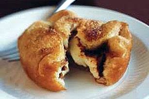 MIX sugar and cinnamon in shallow dish. Dip cream cheese cubes in melted butter, then roll in the cinnamon sugar. Place 1 cheese cube in center of each dough circle; gather up sides of dough to enclose filling. Press edges of dough together to seal. Place, seam sides up, in lightly greased muffin pan. Drizzle with any remaining butter; sprinkle with any remaining cinnamon sugar.