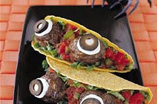 Make spooky taco flavored meatballs that look like eyeballs in your taco shells. Serve with shredded cheese, extra salsa and sour cream and a side of guacamole.