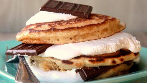 Stack pancakes with marshmallow creme and chocolate bars. Serve with syrup.
