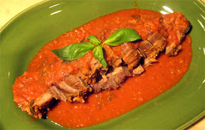 7) Once the braciole has cooked remove from the pan and let it rest for 10 minutes before carving it. Add the fresh basil to the sauce and continue to cook it for 5 more minutes. (Wile the braciole is resting bring a large pot of boiling water to a boil and cook some rigatoni or penne pasta to soak up all that delicious sauce, for a complete meal!)