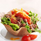 Flour tortillas quickly baked in cupcake tins are filled with lettuce and ground beef, then topped with your favori...