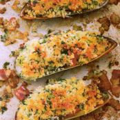 Fresh New Zealand mussels roasted with shallots, crispy bacon, garlic, and topped with a delicious breadcrumb mixtu
