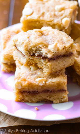 A cross between a chewy blondie and moist butter cake, these blondies are studded with white chocolate chips and ri
