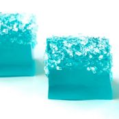 Ocean blue margarita jello shots topped with large crystal sugar make for beautiful table settings for a NFL Dolphi
