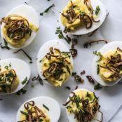 Deviled eggs topped with a crispy shallot gremolata are packed with zesty flavor and are sure to be a hit at your n...