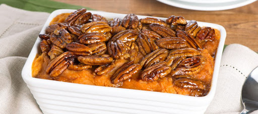 A perfect sweet potato side dish with a hint of orange flavor, topped with sugary pecans