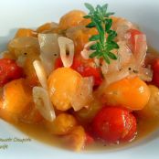 Roasting cherry tomatoes with sweet onion, white wine and herbs takes only 15 minutes for a perfect tomato compote ...